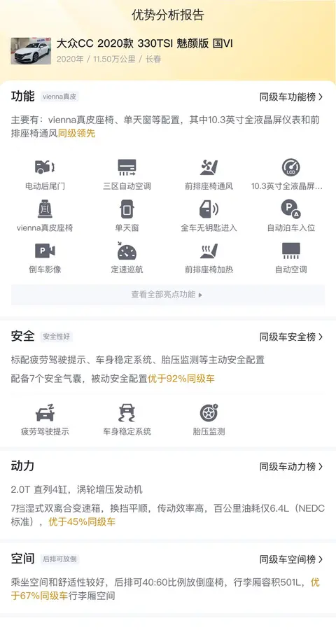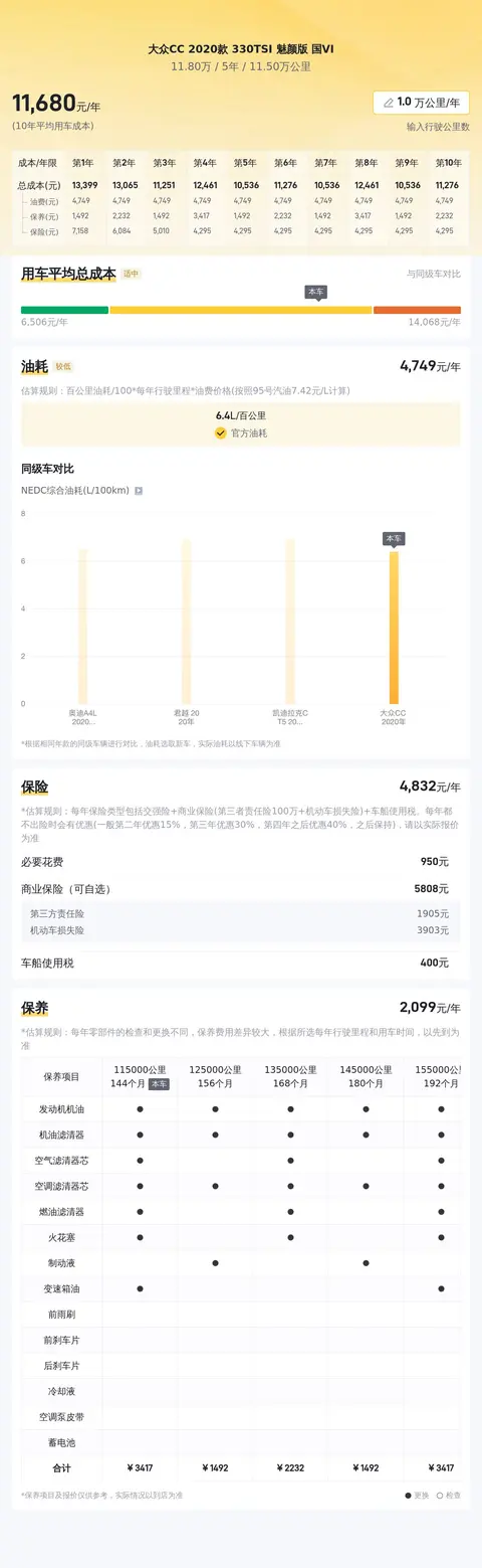 据估算,同级车的最低用车成本是8610元/年,最高是15473元/年,大众CC 2020款 330TSI 魅颜版 国VI是12267元/年,用车成本不算低。