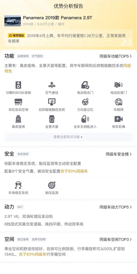 综上所述的新车含税价、用车成本、市场行情、优势分析、同款比价等数据仅供参考。在配置部分,因为二手车非标品,车辆可能会存在配置改装的情况,具体车况信息需要线下结合车辆实际情况进行综合参考。