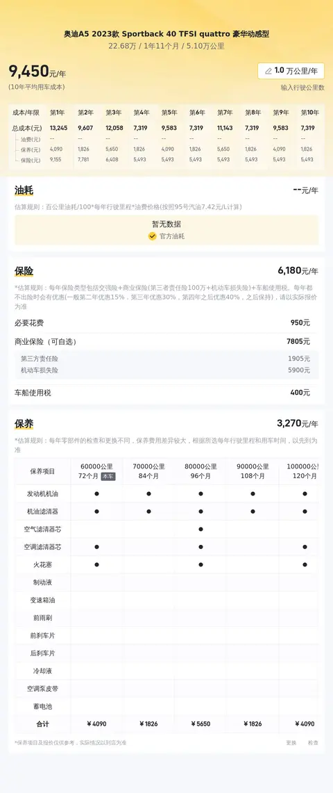关于奥迪A5的用车成本,我们以年均行驶1万公里计算,包括保险、保养及其他费用在内,年均总成本大约为13681元。值得注意的是,实际费用会根据个人使用习惯及车况维护情况有所变动。