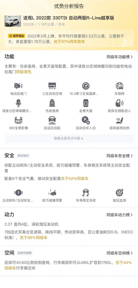 今天给大家带来的这台车是途观L 2022款 330TSI 自动两驱R-Line越享版,首次上牌时间为2022年03月,车源地和车牌地均为苏州,外观为白色,有1次过户记录。截至目前,该车行驶里程为1.8万公里,符合国VI排放标准。目前该车市场报价为15.8万元,相较于新车指导价24.38万元,便宜了8.58万元。