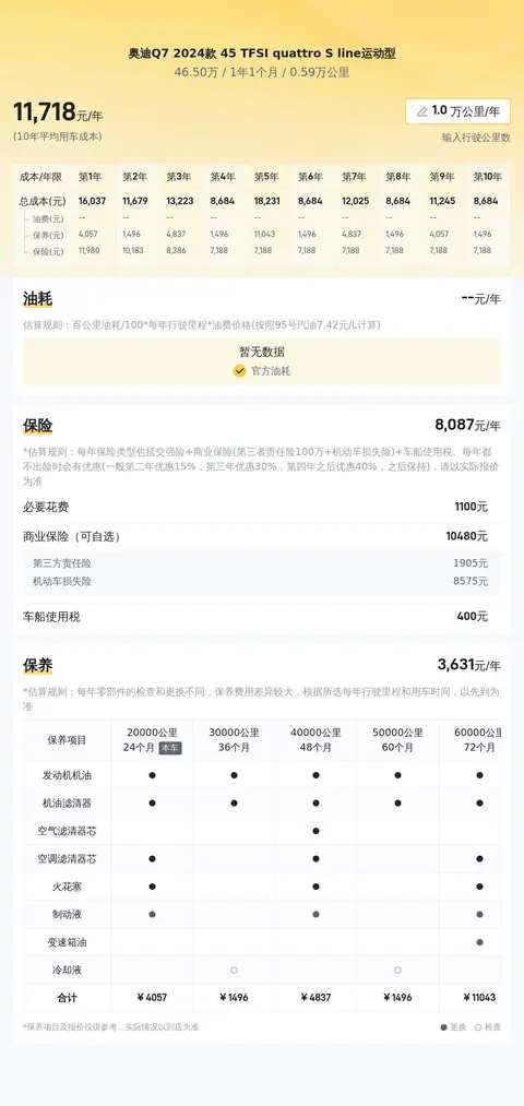 奥迪Q7 2024款 45 TFSI quattro S line运动型在配置、性能、空间等方面都展现出了奥迪品牌的实力和匠心独运。作为一款豪华中大型SUV,它不仅具备出色的驾驶性能和舒适的乘坐体验,还拥有丰富的配置和先进的科技。这款车的10年平均用车成本大约在每年2.1万元左右,相对来说较为合理。当然,这个数字还会根据您的实际使用情况和保养情况有所浮动。希望该车能给您带来愉悦的驾乘体验!