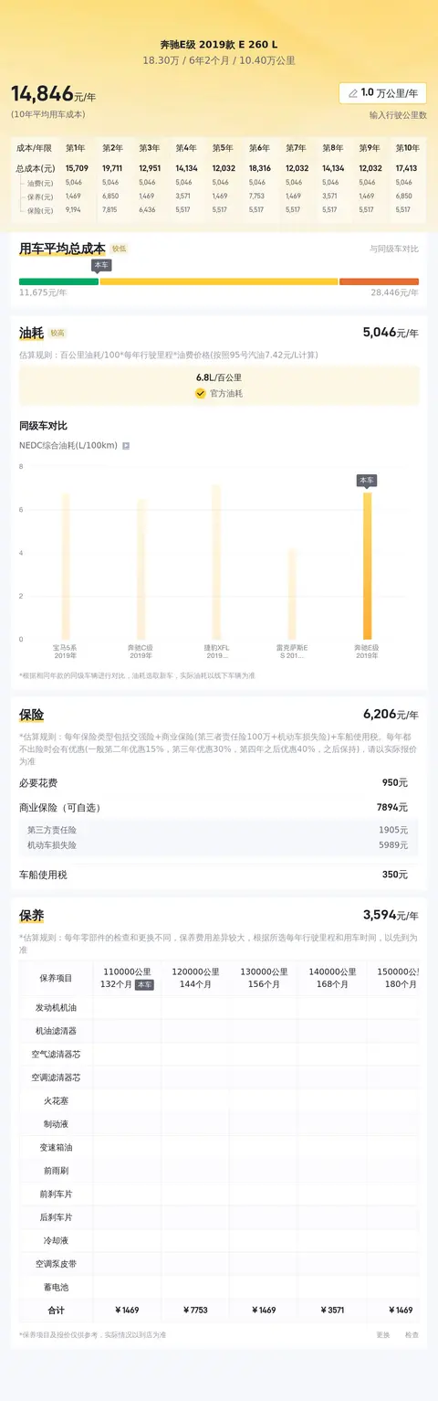 这辆车的十年平均用车成本为8617元/年,与同级车相比处于适中的水平。其每年的保险费用大约为5104元,保养费用约为2146元,洗车费用按照每年7次计算,每次20元,油费因个人驾驶习惯而异,按照6.8L/百公里的油耗计算,每年大约需要5382元。这些费用提供了对该车型长期使用成本的大概估算。