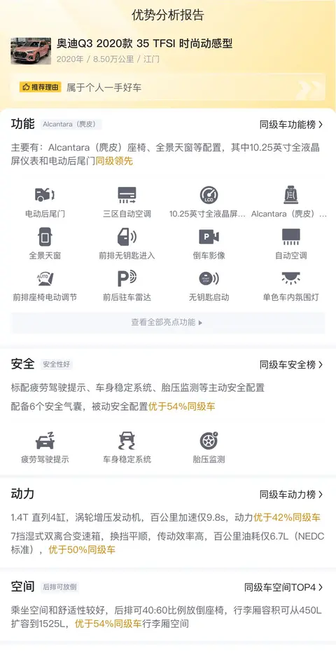 综上所述,这辆奥迪Q3 2020款 35 TFSI 时尚动感型在二手车市场上表现出了极高的性价比。它不仅拥有出色的外观设计和精致的内饰,更在动力性能、安全配置等方面表现出色。如果您正在寻找一款性价比高、性能卓越的豪华SUV,那么这辆奥迪Q3无疑是一个值得考虑的选择。