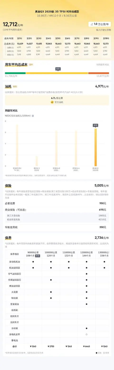 在用车成本方面,这辆车年均综合用车成本大概在每年1.3万元左右。具体费用包括保险、保养、燃油和其他费用。根据预估,这辆车的保险费用每年约5765元,保养费用每年约4380元,燃油费用每年约3165元,其他费用根据个人情况而定。这些费用会根据车况、地区消费水平和个人驾驶习惯等因素有所不同。
