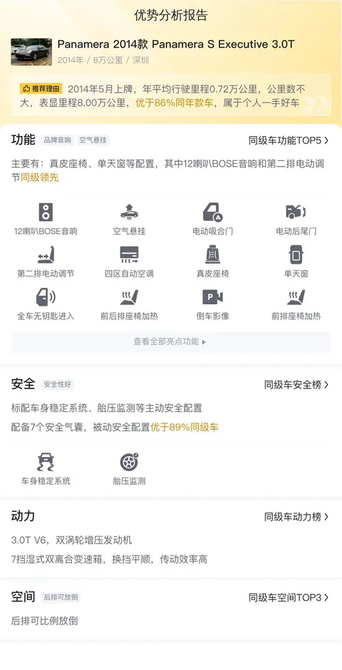优势:Panamera 2014款 Panamera S Executive 3.0T的市场行情价是25.87万-33.65万,它的报价则是25.80万,报价低于市场行情价,还是0过户,算是捡漏车型了。知名度高,配置丰富,尤其是安全配置,7个安全气囊,一旦发生事故,能够全方位保护车内人员的安全,将伤害降到最低。动力强悍,3.0T V6,双涡轮增压发动机,7挡湿式双离合变速箱,换挡平顺,传动效率高。