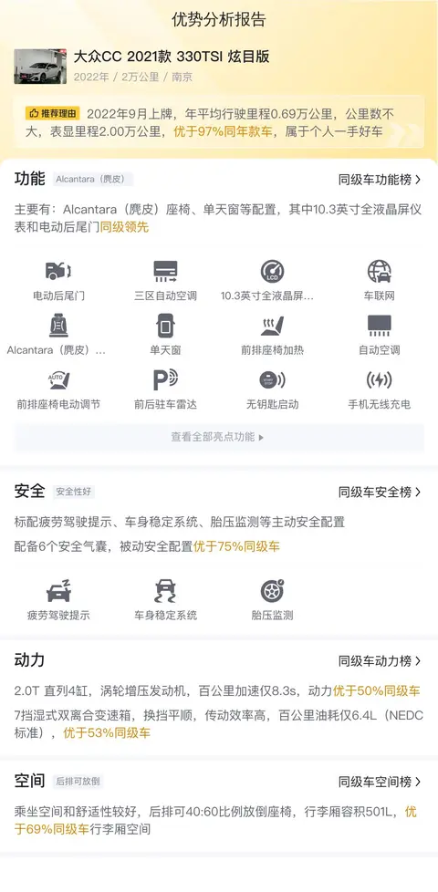 该车是大众CC 2021款 330TSI 炫目版,白底色,前驱,自动变速,排量2.0T,国VI排放标准,属于中型轿车。2022年9月上牌,车牌所在地和车辆所在地都是南京,至今行驶了2万公里,未过户。这辆车当时的新车指导价是24.99万,现在二手车报价14.38万。