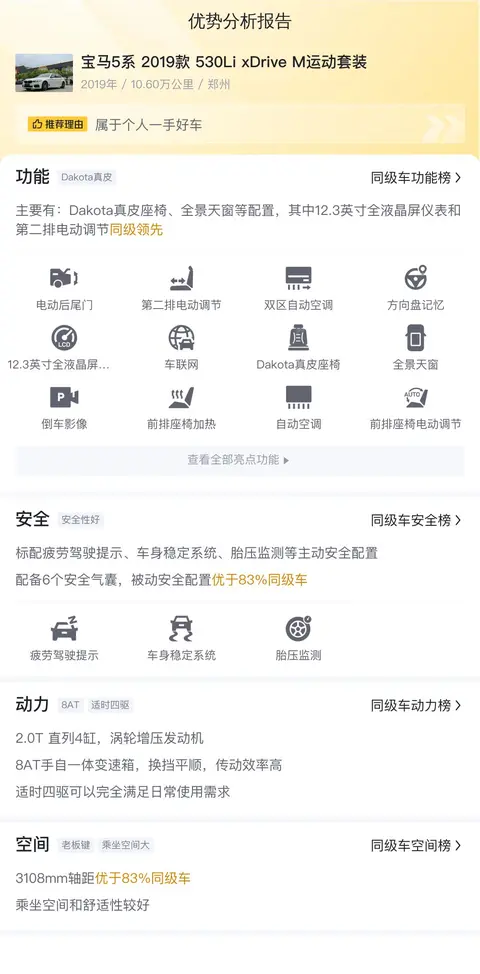 另外,同级车的最低10年平均用车成本是14973元/年,最高是17778元/年,而这辆宝马 5系 2019款 530Li xDrive M运动套装是15464元/年,适中的水准,也可以接受。