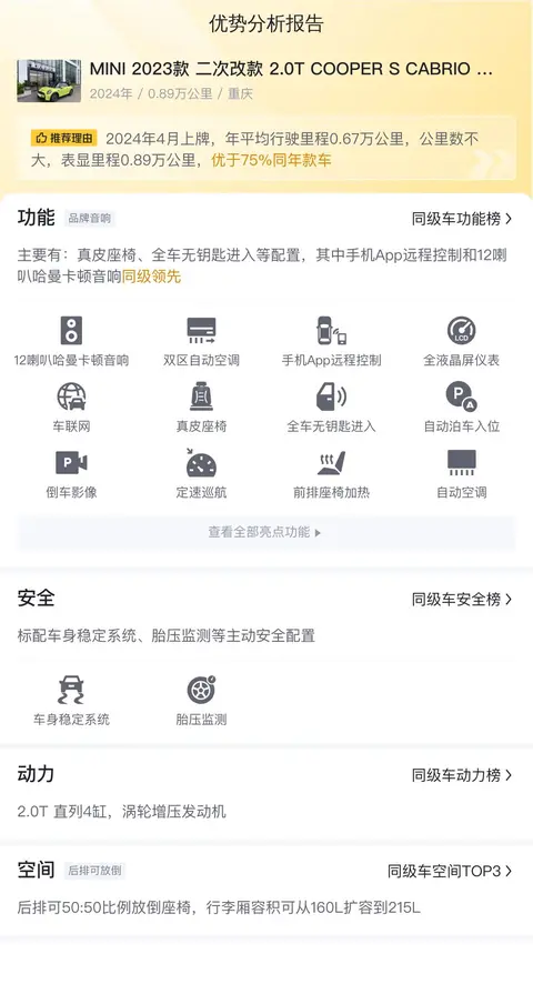 要说在马路上能惊艳到我的车,我必须得投MINI(图片|配置|询价)一票。这辆汽车界的时尚小精灵,1959年在英国出生,后来被宝马爸爸收养。MINI一出现,就让宝马爸爸眼睛一亮,决定要把它打造成高端子品牌,搞点特别的动静。MINI车头圆润,车尾挺翘,那线条流畅的,就像是个小巧的时尚icon,蹦蹦跶跳地走在大街上,回头率杠杠的!驾驶起来也是灵活得不得了,就像是跳舞一样,在城市里穿梭,轻松又带感。今天咱们要看的这辆MINI 2023款 二次改款 2.0T COOPER S CABRIO 艺术家,车源地是重庆,上牌地是重庆,上牌日期2024年04月,表显里程8900公里,新车含税价40.22万,现价27.98万,过户次数2次。
