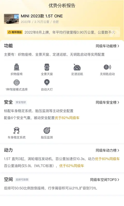 咱们来看看这辆MINI在二手车市场的行情。懂车帝通过大数据分析,给出了一个综合评分——82%,这意味着它的性价比还挺高的哦!在价格方面,这辆车比全国相似车的售价高出了11%,报价13.98万元。虽然价格相对较高,但如果车况良好并且你真的喜欢,也是值得考虑滴!
