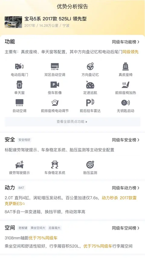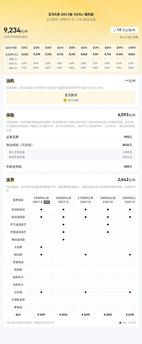在用车成本方面,根据大数据分析,这款宝马5系2017款525Li领先型的10年平均用车成本约为13681元/年,而本车的10年平均用车成本大约在13681元/年,与同级别车相比处于适中的水平,是一个比较合理的范围。