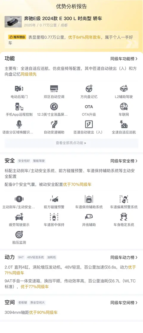 我们的这一款奔驰E级 2024款 E 300 L 时尚型轿车,车源地为成都,上牌时间为2025年3月,黑色车身,到目前为止未过户,表显里程为7700公里。此车符合国六排放标准,搭载了一台高效的发动机,动力强劲且节能环保。无论是城市驾驶还是长途旅行,它都能为您提供顺畅的驾驶体验。新车指导价49.98万,目前二手车报价42.3万。