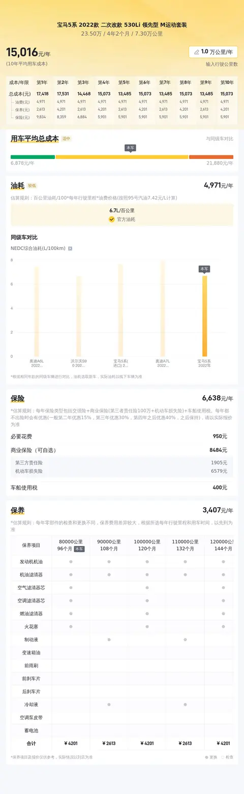 接下来,我们粗略评估一下这辆车的用车成本。这里有个小技巧,一般经验显示,车辆的使用成本经常与新车售价有直接联系。当然,也会受到车龄、保养情况以及其他因素的影响。因此,虽然我们可能会发现某些维护或保险费用大致相似,但总体开支很可能会有明显差异。细心的车主可能会发现,随着车辆老化,维修保养的频率和费用似乎也在悄悄增加。因此,虽然我们无法一一列出所有可能的费用细节,但会尽力提供一个近似的估算,以帮助您做出明智的决策。