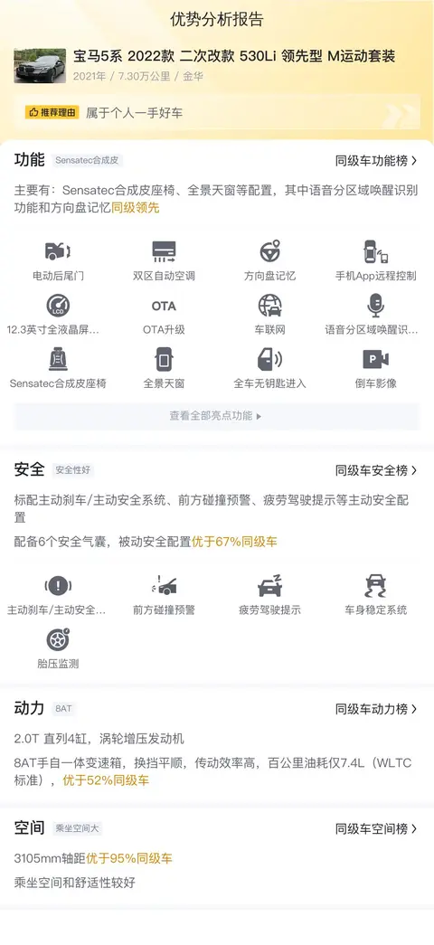 宝马5系(图片|配置|询价)的历史可以追溯到1961年,当时宝马1500在法兰克福车展上展出,这可以被视为宝马5系的前身。到了1970年,宝马为了与奔驰W114系列争夺市场,也加速了5系的诞生,所以从某种角度来说,宝马5系是一个肩负着品牌期望的系列。而今天我们要介绍的这辆宝马5系 2022款 二次改款 530Li 领先型 M运动套装,它完美的继承了宝马5系的运动基因,为喜欢宝马这个品牌的车友们提供了一个不错的选择。目前这辆车还未过户,跑了有7.3万公里,挂牌量4年,售价23.5万。