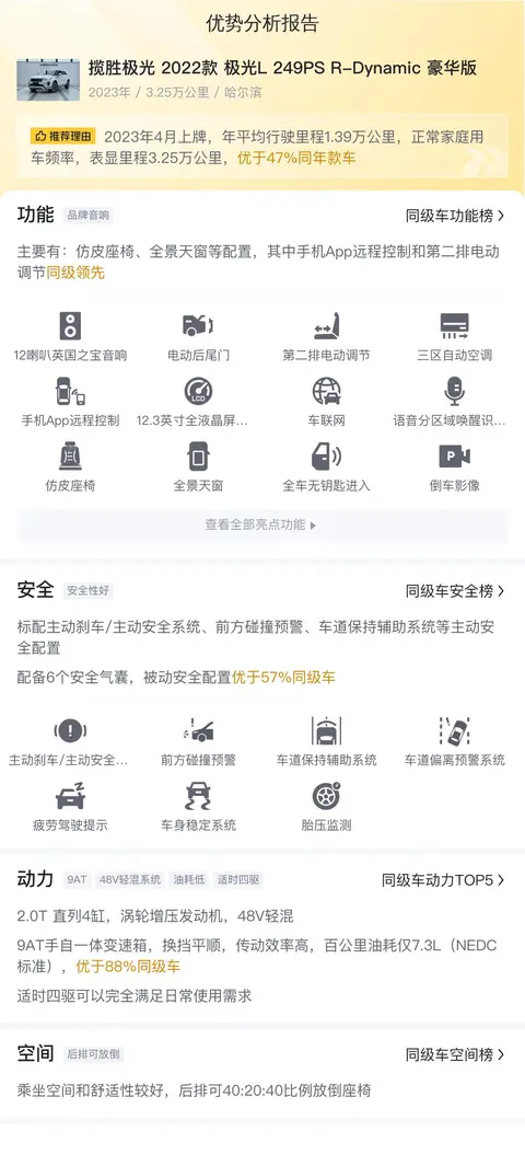 综上所述的新车含税价、用车成本、市场行情、优势分析、同款比价等数据仅供参考。在配置部分,因为二手车非标品,车辆可能会存在配置改装的情况,具体车况信息需要线下结合车辆实际情况进行综合参考。