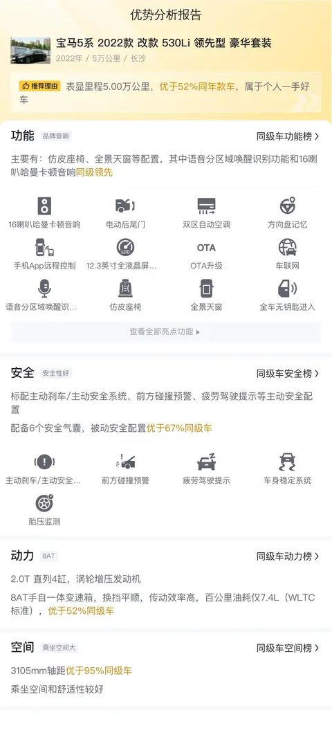 该车是2022年5月上牌的,车龄较短,行驶里程5万公里,车源地和上牌地都是长沙,车身黑色,内饰深色,个人一手车。宝马5系2022款改款530Li领先型豪华套装的新车指导价为47.19万,现在的二手车报价24.28万,开三年多便宜一半,可见其保值率还是不错的。