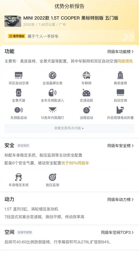 MINI是经典车型了,有着很高的辨识度,从1959年诞生到现在,有着一大批忠实的粉丝。每一辆MINI都代表了车主独特的个性,驾驶MINI更是一种生活方式的体现。这款2022款 1.5T COOPER 黑标特别版 五门版整体来说基础配置到位,而且价格不高,只要14.9万,适合年轻人玩乐使用,不过后期维修保养费用高,还是要量力购买。