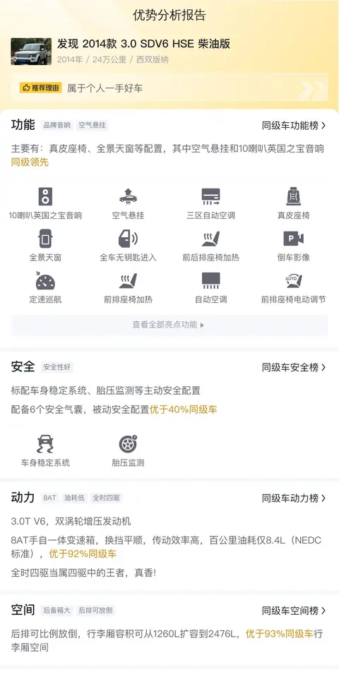 综上所述的新车含税价、用车成本、市场行情、优势分析、同款比价等数据仅供参考。在配置部分,因为二手车非标品,车辆可能会存在配置改装的情况,具体车况信息需要线下结合车辆实际情况进行综合参考。