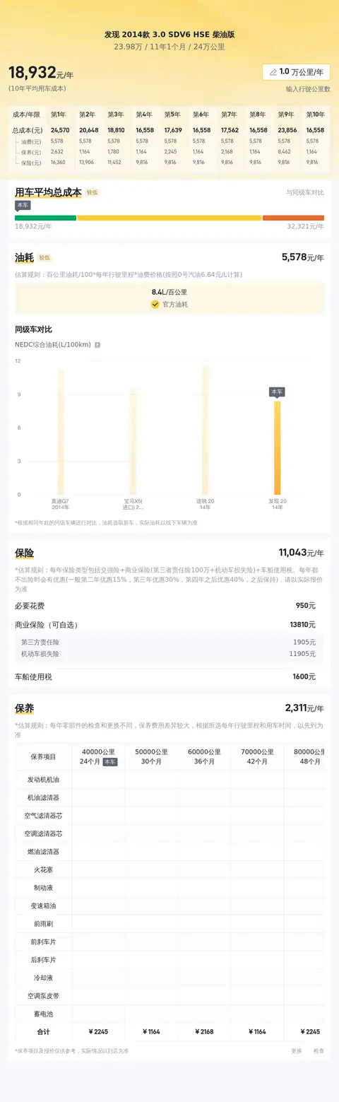 在车辆使用成本方面,根据估算,这款二手路虎发现的年均综合使用成本约为1.9万元,其中包括油费、保险费及保养费用。然而,受多种因素的影响,实际费用可能会有所变动。对于那些计划购买二手车的消费者来说,了解车辆的使用成本是制定预算的重要环节。虽然每一辆车的实际情况都不同,但通过估算可以为消费者提供一个大致的参考范围,帮助他们做出更为明智的决策。