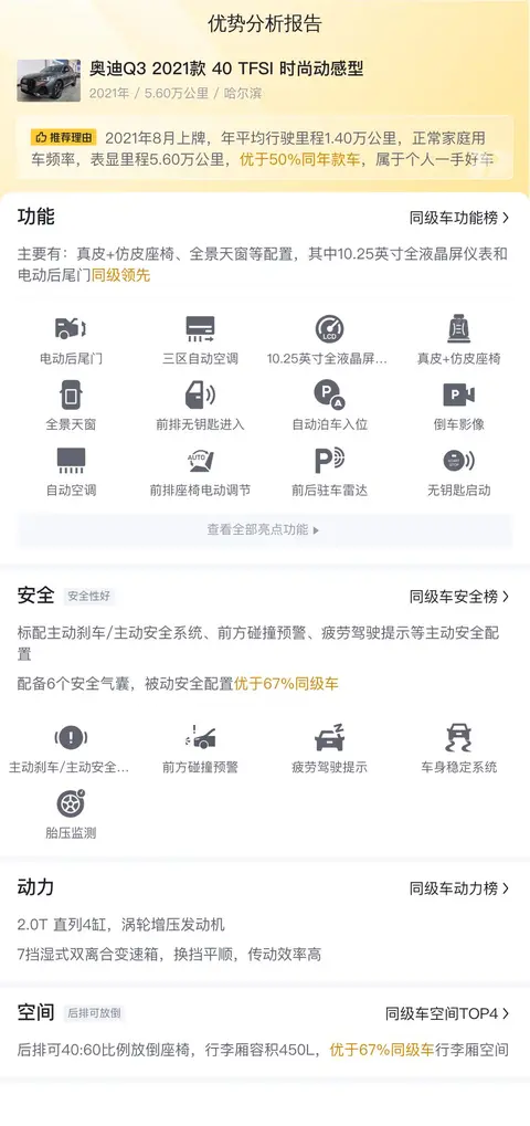 这款奥迪Q3 2021款 40 TFSI 时尚动感型在动力、空间、内饰、以及油耗方面,相比同级别竞品车型,都还是具有一定优势的,下面我为您详细分析一下。