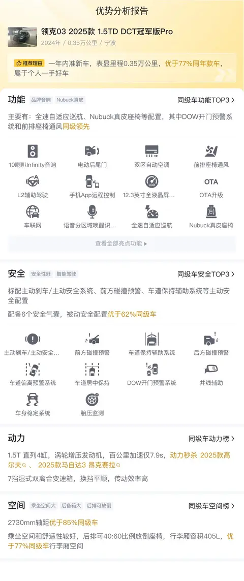 2016年10月20日,意大利米兰,领克品牌全球首发,以“生而不同、破浪前行”的新高端汽车品牌正式进入人们的视野。领克以“挑战惯例”为品牌价值主张,打破传统汽车品牌的模式,以消费者需求为核心,致力于提供高品质、个性化、智能化的出行体验。作为吉利汽车高端子品牌,其产品具有一定的市场竞争力,深受年轻用户的青睐。今天要为大家介绍的这辆二手领克03(图片|配置|询价) 2025款 1.5TD DCT冠军版Pro,是一辆2024年11月上牌的车型,截至目前实表里程数仅为3.5万公里,车源地跟上牌地均为宁波,未曾有过过户记录,符合国VI排放标准。新车含税指导价为15.21万,现卖家报价10.98万。