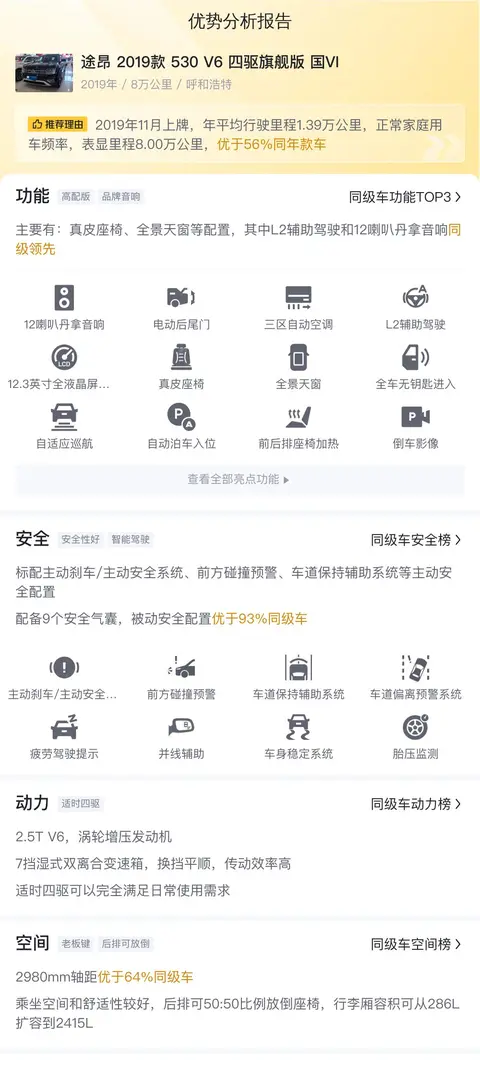 综上所述的新车含税价、用车成本、市场行情、优势分析、同款比价等数据仅供参考。在配置部分,因为二手车非标品,车辆可能会存在配置改装的情况,具体车况信息需要线下结合车辆实际情况进行综合参考。