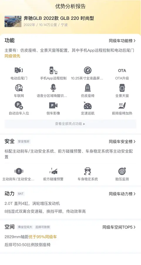 综合来看,这辆二手奔驰GLB是一款性价比较高的豪华SUV。它有着奔驰品牌的强大背书、宽敞舒适的内部空间和丰富的配置,让驾驶者和乘客都能享受到高品质的驾乘体验。虽然说动力表现可能不是特别出色,但也足以满足日常使用需求。如果你正在寻找一款价格合理、品质可靠的豪华SUV的话,不妨来看看这辆车吧!最后,需要注意的是,由于这辆车没有检测报告,所以具体的车况还需要您实地查看并综合参考哦~