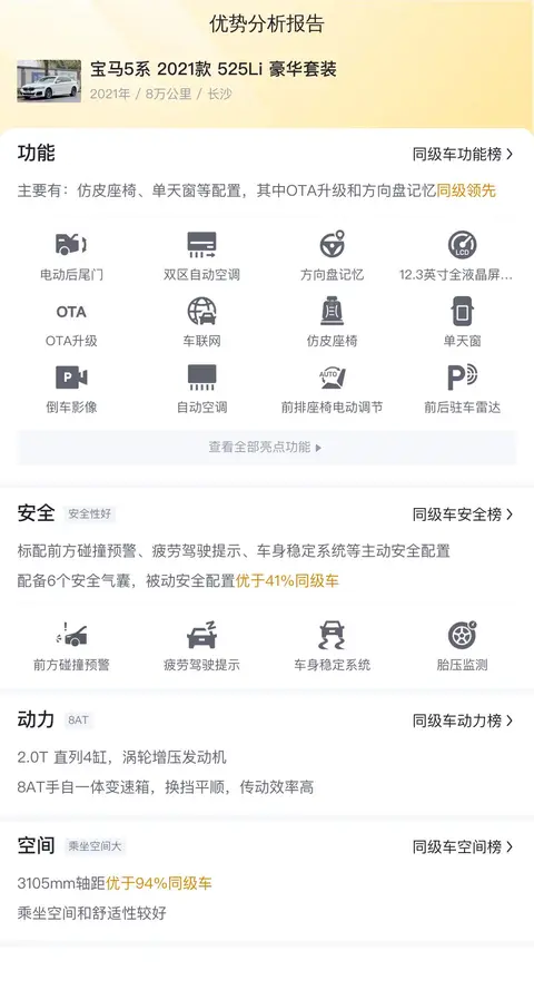 该车的具体版本是——宝马5系 2021款 525Li 豪华套装,上牌地为长沙,上牌日期2021年8月,表显里程8万公里,新车指导价42.69万,二手车报价20.88万,过户次数1次。