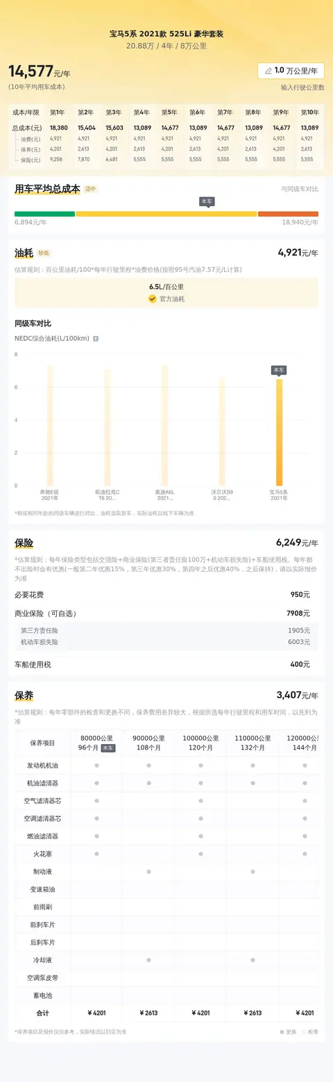 根据预估数据,这辆宝马5系 2021款 525Li 豪华套装的10年平均用车成本约为13,987元/年,这包括油费、保养费及保险费等常规用车开支。这一预估成本为潜在车主提供了关于该车型长期使用成本的大致参考,帮助车主合理规划财务预算。