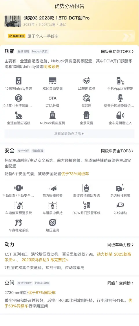 不到10万的车,都有哪些好用的配置呢?领克03 2023款 1.5TD DCT劲Pro配备了全速自适应巡航、真皮+仿皮座椅、车道居中保持、双区自动空调等配置。安全配置上,标配主动刹车/主动安全系统、前方碰撞预警、车道保持辅助系统等主动安全配置,配备6个安全气囊,被动安全配置优于67%同级车。