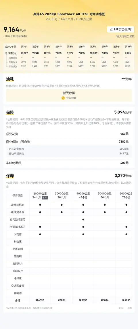 另外,根据估算,这辆奥迪A5 2023款 Sportback 40 TFSI 时尚动感型的10年平均用车成本大约在每年1.3万元左右,这一成本在同级别车型中属于适中的水平。需要指出的是,实际用车成本可能会根据用车频率、行驶环境、油价波动以及个人驾驶习惯等因素有所变化。
