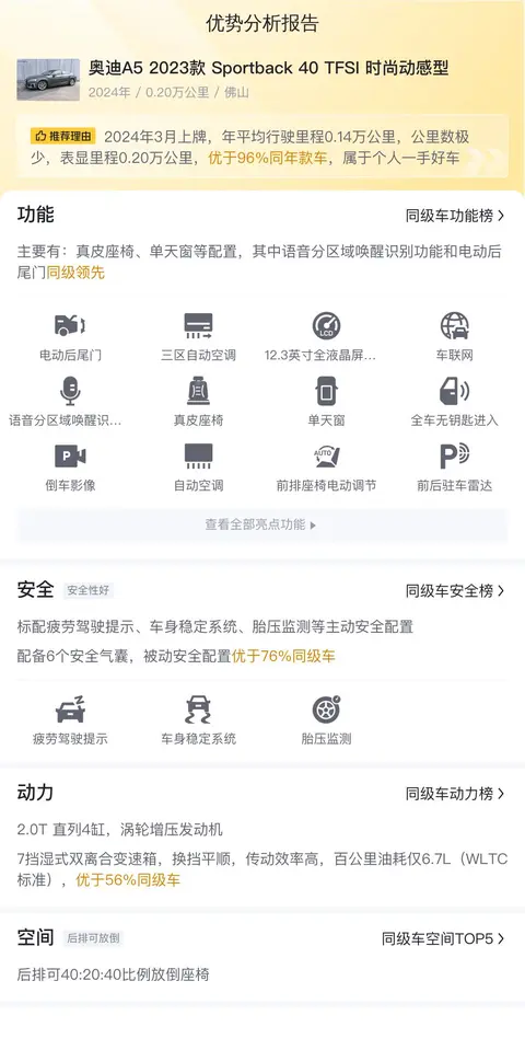 总的来说,这辆奥迪A5 2023款 Sportback 40 TFSI 时尚动感型在车辆状况、配置丰富程度以及动力性能等方面都表现出色。它的合理售价、较低的行驶里程以及未经过过户等特性,使得它在二手车市场上具有一定的吸引力。当然,在做出购买决策之前,建议您亲自到店查看车辆实际情况,结合自身需求和预算进行综合考量。