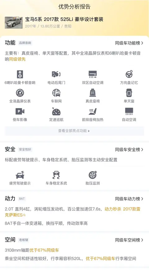 该车的具体版本为——2017款改款525Li豪华设计套装,上牌地为贵阳,上牌日期2017年1月,表显里程13.80万公里,新车指导价49.96万,二手车报价11.38万,过户次数1次。
