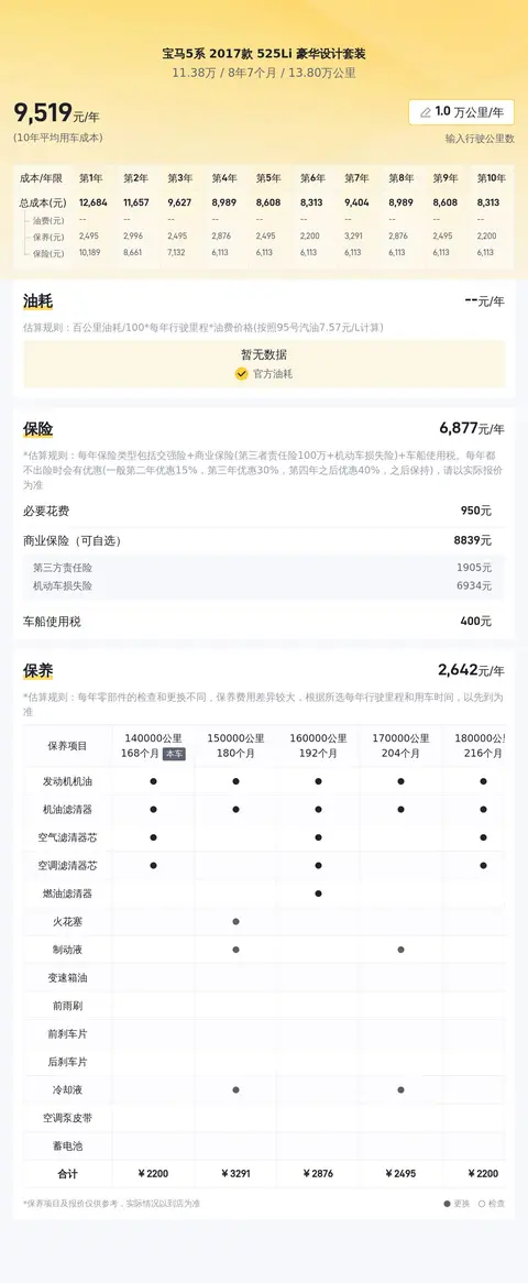 这辆车的10年平均用车成本大约在每年2.1万元左右,具体金额根据车主的实际使用情况而有所不同。包括油费、保险费和保养费等方面。