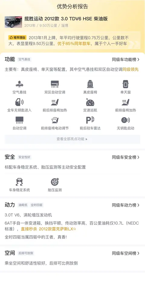 总结:以上就是我们对这辆二手揽胜运动 2012款 3.0 TDV6 HSE 柴油版的详细解析。在做出购买决策之前,请务必亲自查看车辆实际情况,确保它符合您的期望与需求。
