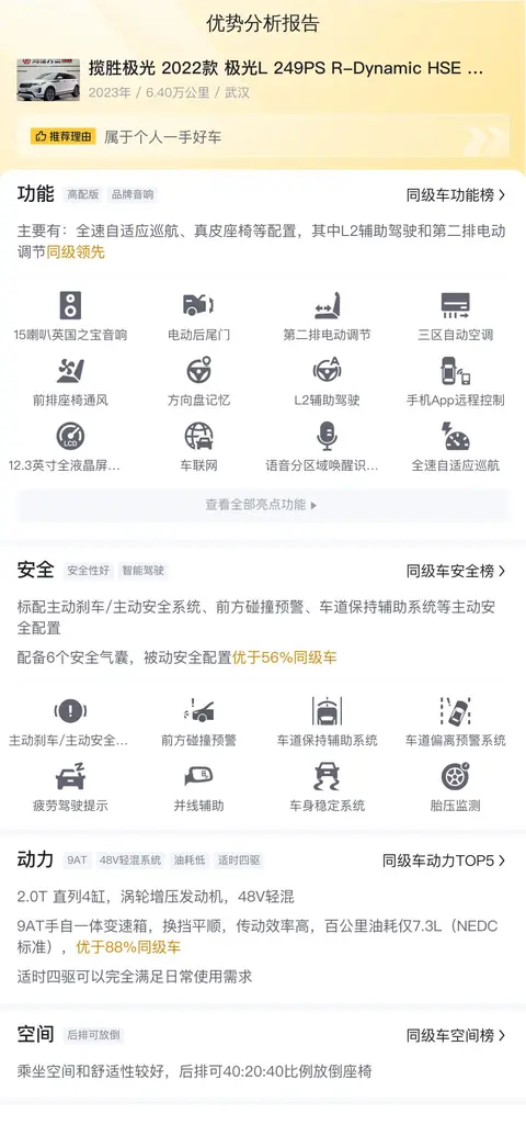 揽胜极光 2022款 极光L 249PS R-Dynamic HSE 奢享版的市场行情价是16.19万-19.10万,它的报价则是19.10万,报价虽然合理,但没有优势,不过它行驶里程较少,车况更新,同时又是2022款,配置也会更高一些。