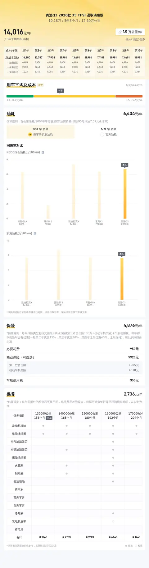 奥迪Q3 2020款 35 TFSI 进取动感型的10年平均用车成本大约在14180元/年,这一成本在同级别车型中处于适中的水平。