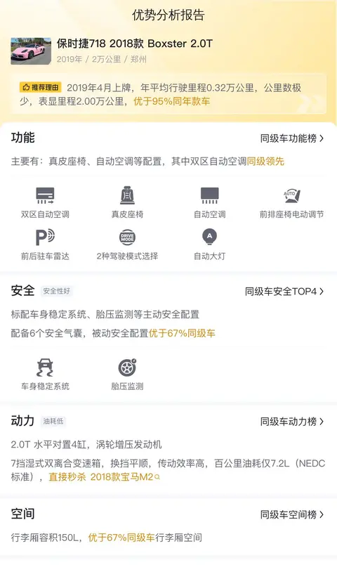 此外,根据估算,这辆二手保时捷718 2018款 Boxster 2.0T的用车成本也不算低,因为同级车的最低用车成本是15388元/年,最高是21111元/年,而这辆二手保时捷718 2018款 Boxster 2.0T的是18555元/年,所以不算低。