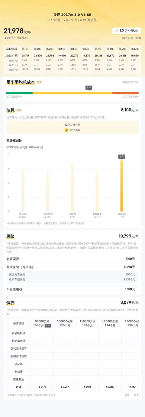 发现 2017款 3.0 V6 SE的10年平均用车成本是22469元/年,而同级车的最低10年平均用车成本是19763元/年,最高是46780元/年,所以它的用车成本较低。