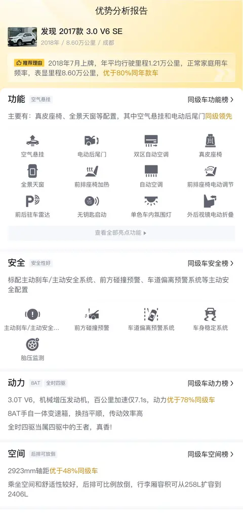 综上所述,对于这辆发现2017款3.0 V6 SE,如果您注重强劲的动力性能、豪华舒适的内饰以及先进的电动后尾门和空气悬挂系统,那么它仍然是一款值得考虑的车型。然而,如果您对油耗、储物空间、后排座椅舒适性以及智能化程度有较高要求,那么您可能需要再考虑考虑。建议您在做出购买决策之前,务必亲自试驾,全面了解车辆的优缺点,确保其符合您的具体需求和期望。