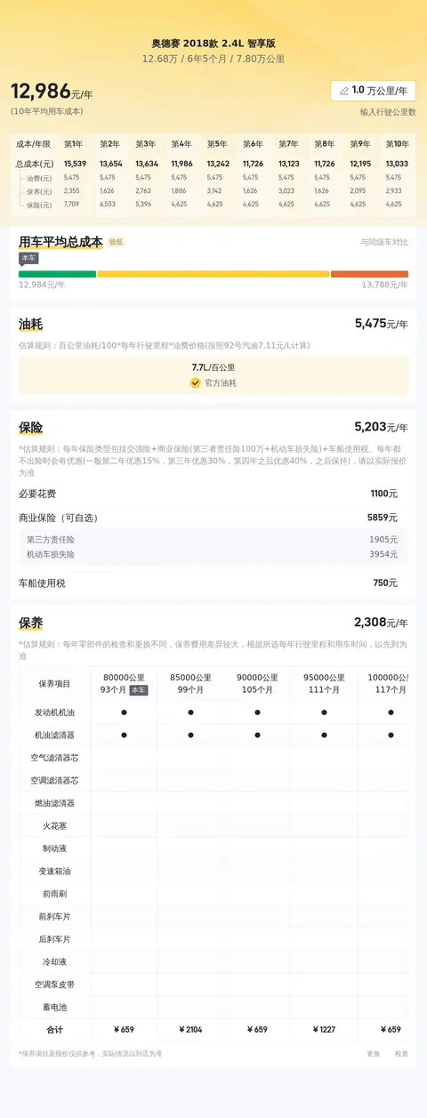 据估算,奥德赛 2018款 2.4L 智享版的用车成本较适中,因为它的百公里油耗为7.7L,每年的保养费用大约是2333元,原价29万的车,这样的花费适中。