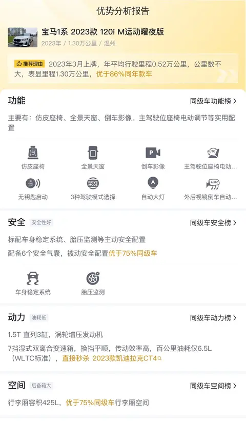 这辆宝马1系 2023款 120i M运动曜夜版优势与不足都挺明显的。优势方面,10万出头能买到一辆宝马轿车,满足了很多消费者对豪华品牌的追求,同时这辆车省油、配置丰富,尤其是全景天窗和倒车影像,很实用。宝马品牌的品质和工艺通常较高,车辆在使用过程中能够保持良好的可靠性和耐用性,减少维修和保养的麻烦和费用。