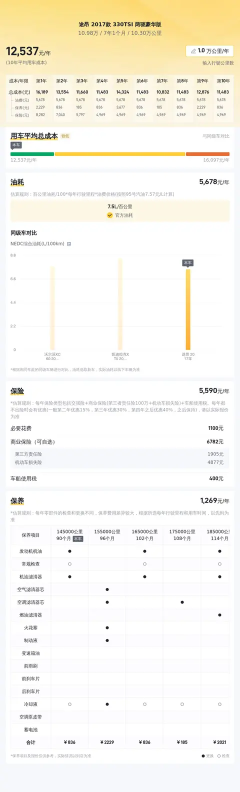 基于懂车帝的大数据分析,这辆车的10年平均用车成本大概是13442元/年,这个用车成本是指保险费用+保养费用+燃油费用减去您的车辆折旧费用之后的用车真实成本,折旧费用咱没计算在内,折旧费用咱也没计算在内,就按照每年13442元计算,具体费用金额可能会根据用车习惯不同而有所改变。
