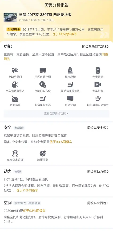途昂(图片|配置|询价)是大众旗下的一款中大型SUV,2017年3月29日,上汽大众旗舰级SUV途昂正式上市,共推出2.0T和2.5T两种排量,共计9款车型,售价区间为30.89-51.89万元。途昂的出现填补了大众在中大型SUV市场的空白,作为一款拥有宽敞空间、强劲动力和丰富配置的SUV,满足了家庭用户对舒适性和实用性的需求。今天我们就为您带来一辆二手途昂,具体版本为途昂 2017款 330TSI 两驱豪华版,该车搭载2.0T发动机,匹配7挡双离合变速箱,上牌日期2018年7月,已行驶10.3万公里,新车指导价33.89万,二手车报价10.98万,让我们一起来看看这辆车的车况表现如何。