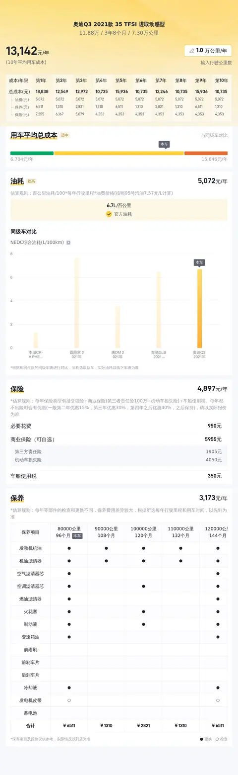 在用车成本方面,根据懂车帝平台的统计,该车型的10年平均用车成本大约在每年1.3万元左右,具体费用根据用车强度和油价波动会有所改变。