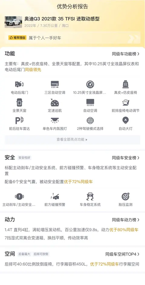 今天介绍的这辆奥迪Q3 2021款 35 TFSI 进取动感型,上牌地为海口,上牌日期2022年1月,表显里程7.3万公里,新车指导价27.43万,二手车报价11.88万,过户次数是0次。