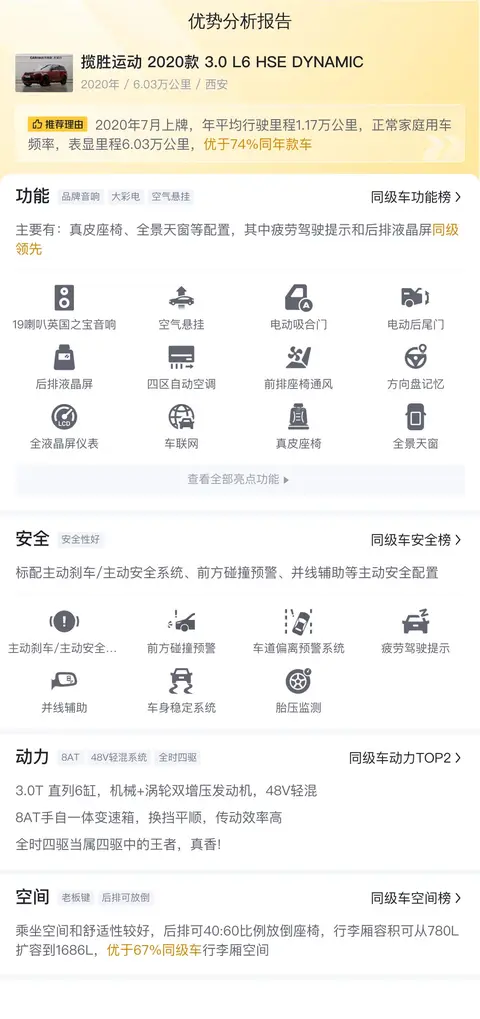 综上所述,揽胜运动版2020款3.0 L6 HSE DYNAMIC作为一款豪华SUV,在动力、配置、空间等方面都表现出色,是一款集豪华与性能于一体的高品质车型。在二手车市场中,它的合理售价和较高保值率使其成为消费者购买二手豪华SUV时的优质选择。同时,根据大数据分析,该车在市场中的竞争力和吸引力也得到了充分证明。如果您正在寻找一款豪华且性能出色的二手SUV,那么不妨考虑一下这款揽胜运动版2020款3.0 L6 HSE DYNAMIC吧!