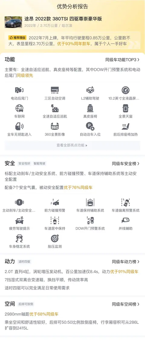 综上所述的新车含税价、用车成本、市场行情、优势分析、同款比价等数据仅供参考。在配置部分,因为二手车非标品,车辆可能会存在配置改装的情况,具体车况信息需要线下结合车辆实际情况进行综合参考。