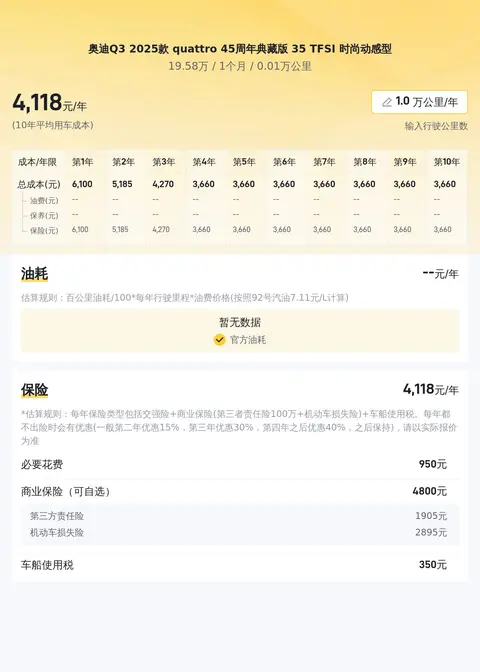 据估算,奥迪Q3 2025款 quattro 45周年典藏版 35 TFSI 时尚动感型的用车成本是5940元/年,同级车的最低是5940元/年,最高是13546元/年,所以它的用车成本较低。