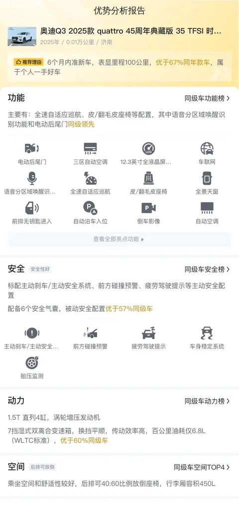 毕竟是2025年的车,所以配置还是比较丰富的。奥迪Q3 2025款 quattro 45周年典藏版 35 TFSI 时尚动感型配备了全速自适应巡航、手机App远程控制、手机无线充电、语音分区域唤醒识别功能、单色车内氛围灯等配置。安全配置上,标配主动刹车/主动安全系统、前方碰撞预警、车道偏离预警系统等主动安全配置,配备6个安全气囊,被动安全配置优于90%同级车。