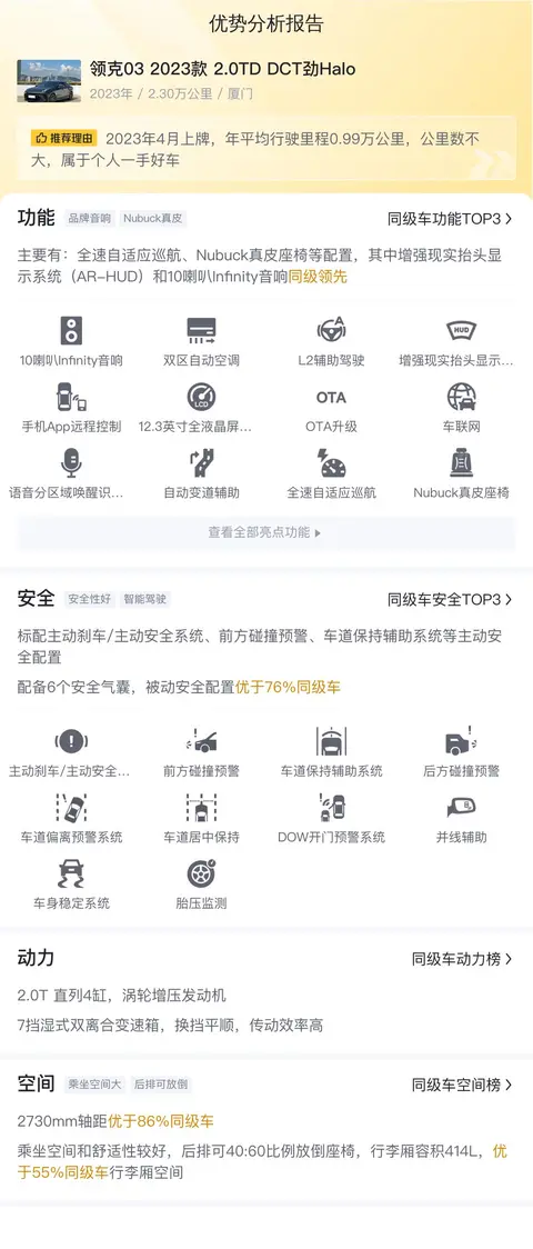 综上所述的新车含税价、用车成本、市场行情、优势分析、同款比价等数据仅供参考。在配置部分,因为二手车非标品,车辆可能会存在配置改装的情况,具体车况信息需要线下结合车辆实际情况进行综合参考。